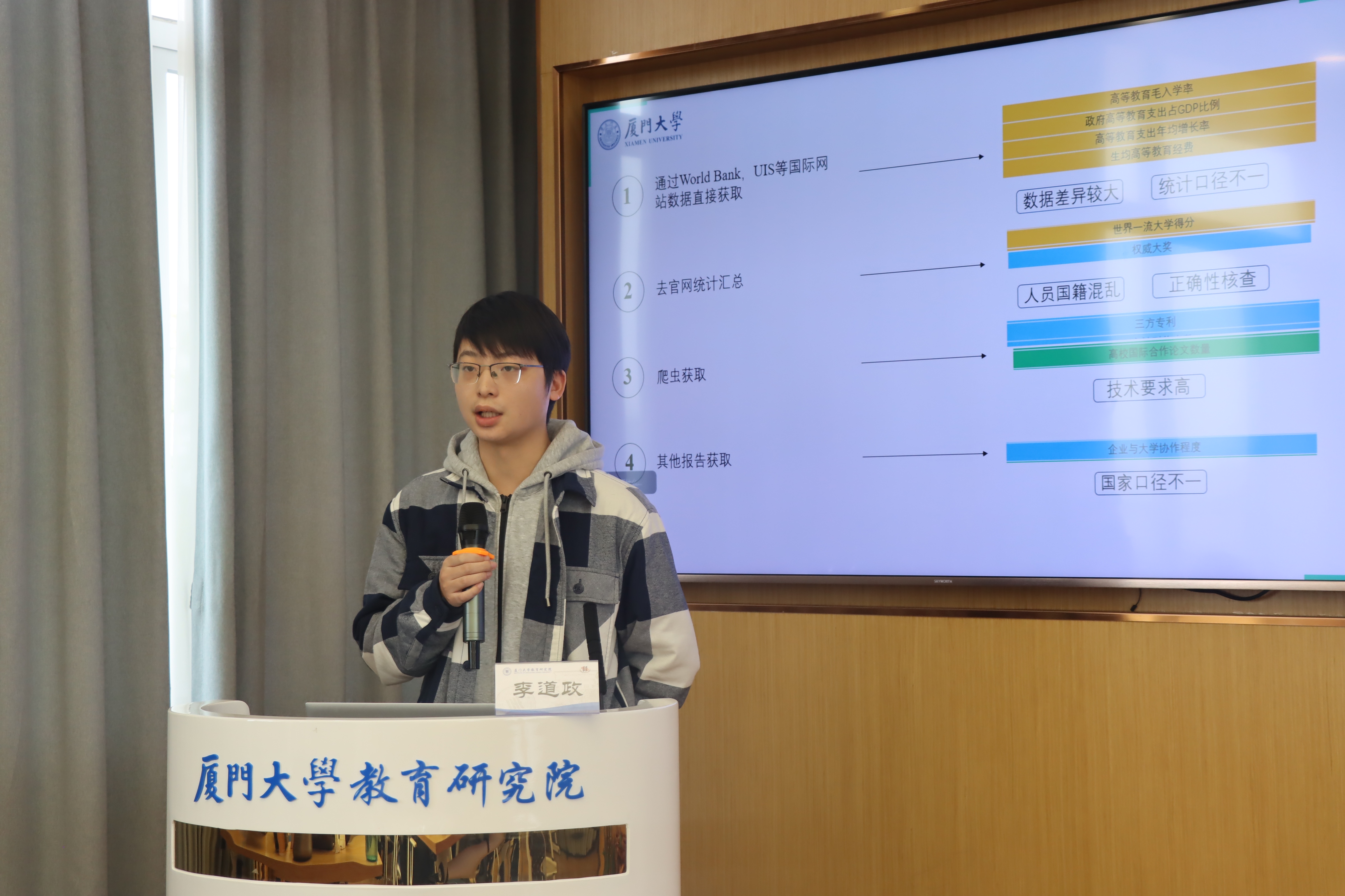 接着,李道政博士生分享了高等教育强国发展水平评价的实践探索和体会经验。他从国家样本选择、数据搜集处理、指标分析筛选等方面介绍了具体的思路和方法,详细讲解了如何处理数据缺失、进行指标分析等做法,并向在场师生展示了中国、美国、英国等几个国家的部分指标情况及比较分析结论。