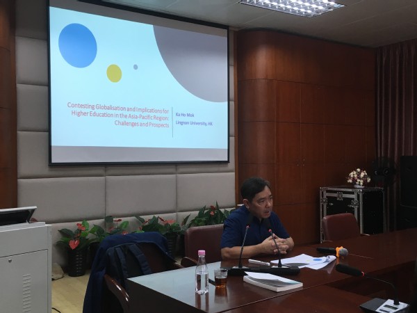 全球化是在世界范围日益凸现的新现象,是当今时代的基本特征。在此背景下,全球各国和地区的高等教育国际化程度不断提高,如何理解和应对高等教育国际化是当今高等教育领域的研究热点。2019年4月27日下午,我中心邀请到岭南大学副校长、林文赞比较政策特聘教授、研究生部主任莫家豪教授,为师生作了题为“Contesting Globalisation and Implications for Higher Education in the Asia-pacific Region:Challenges and Prospects“,探究全球化给亚太地区高等教育带来的挑战和机遇。讲座由文静助理教授主持,覃红霞教授、吴薇教授、刘梦今助理教授 陈斌助理教授等教师以及部分博硕士研究生参加了本次讲座。