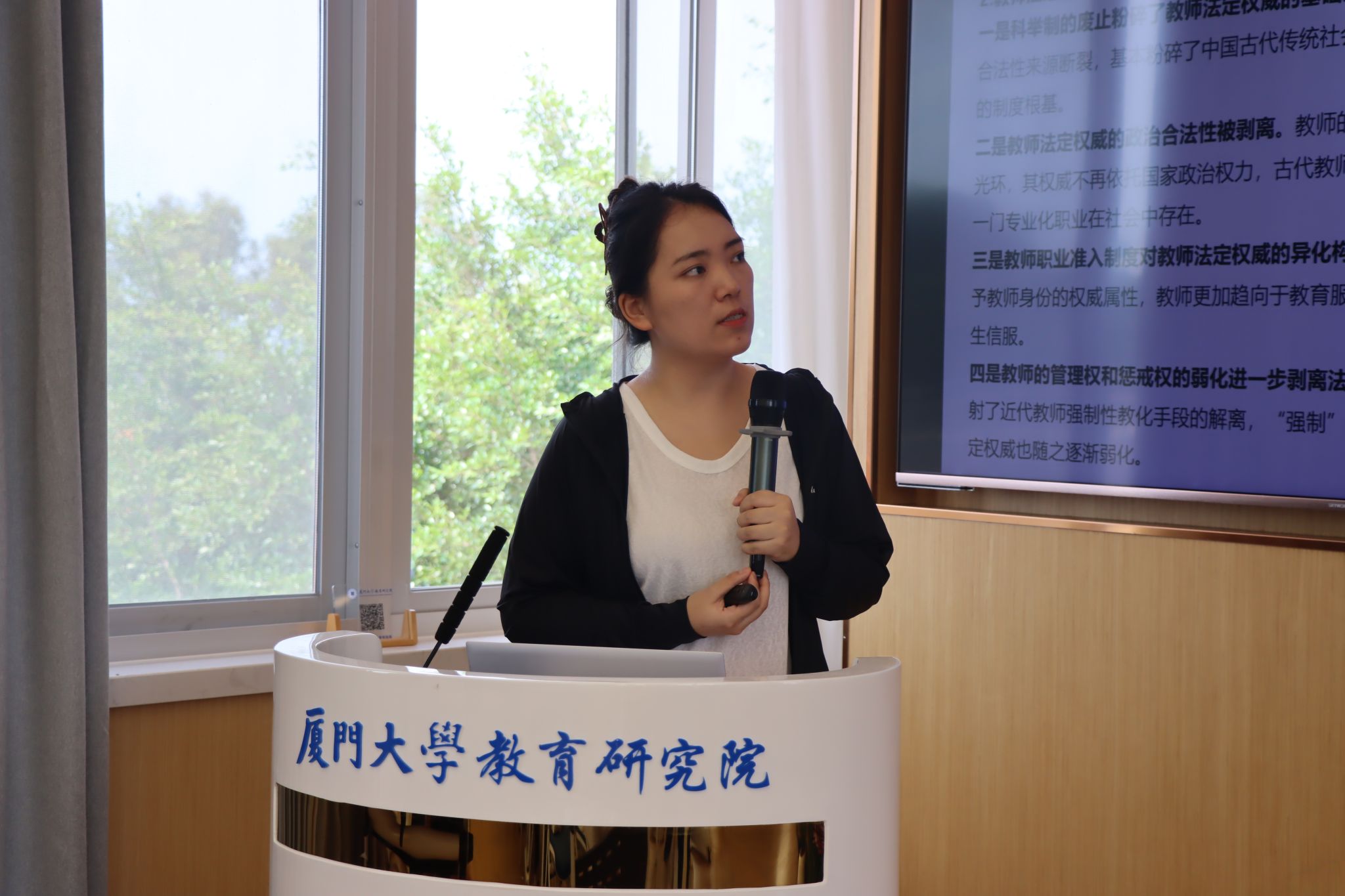 青海师范大学访学博士生张琼作了题为《式微与重塑:中国教师权威的近代嬗变》的报告。研究系统考察了中国教师权威从传统儒家赋权向现代专业认同转型的历史演进过程,从权威的内涵、根基的转移以及形式的革新等三个维度展开深入分析,研究发现,中国教师权威呈现出“传统式微”与“现代重塑”并存的辩证发展态势,既体现了教育现代化进程中权威结构的深层变革,又延续了某些文化基因。