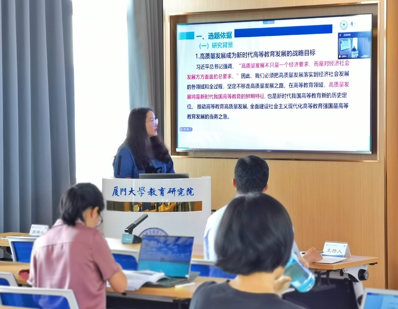 2019级硕士生陈凤菊作题为《高质量发展背景下我国本科教育质量提升路径探寻》报告,她先梳理了高质量发展的概念,其次描述了我国本科教育质量发展现状,得出学生能力发展总体一般,学校学习环境与条件比较能够满足学生学习需求等结论,进而提出创新体制机制,满足学生求学需求,扩大“内外”开放,激发学习兴趣的建议。