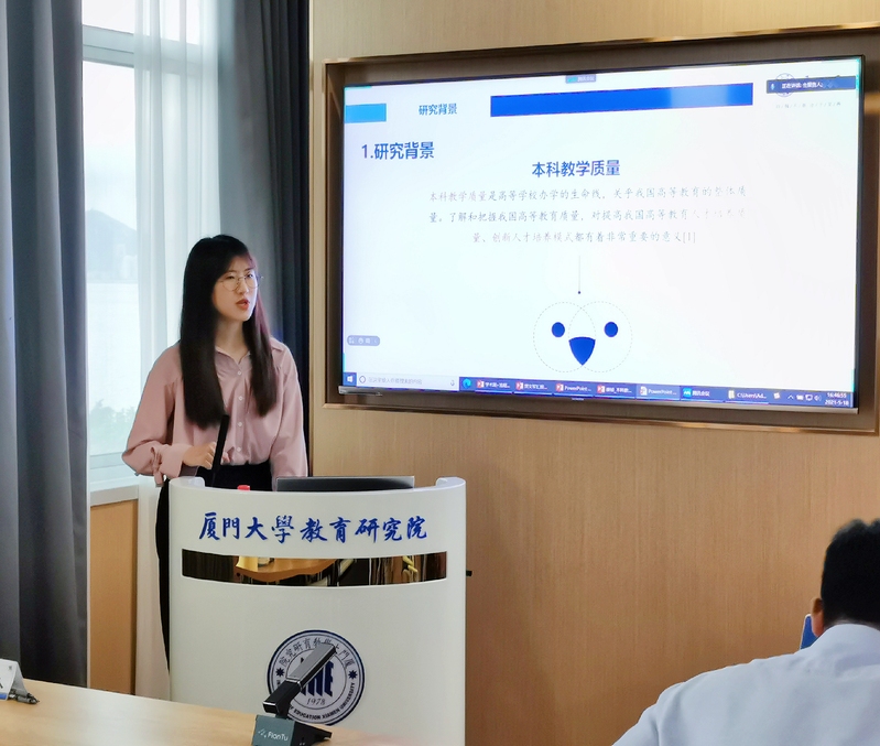 2020级硕士生唐祯作题为《本科教学质量调查问卷的文本挖掘——基于教师视角和学生视角的主题比较》。她从本科教学质量是高等学校办学的生命线,关乎我国高等教育的整体质量的角度出发,关注教师和学生视角,采用LDA模型对调查问卷的文本进行挖掘,对比教师和学生各自最关注的问题、共同关注的问题以及认识存在差异的问题,得出应当贯通教师学生立场,全面认识问题。