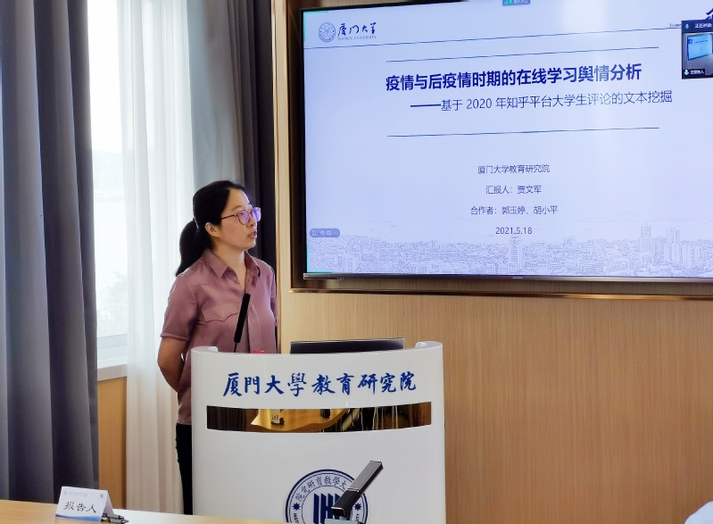 2019级博士生贾文军作题为《疫情与后疫情时期的在线学习舆情分析——基于 2020年知乎平台大学生评论的文本挖掘》她从文本挖掘的角度,采用LDA模型,从时间、空间、语义和情感四个维度挖掘知乎平台大学生评论,进行疫情和后疫情时期的在线学习舆情分析,得出教师及其对网络教学工具的掌握与技术的应用;学生及其自身的主观能动性、负面的情绪宣泄;学习内容的繁简、适切性与压力的轻重等重要结论。