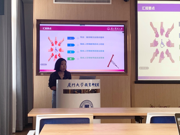 最后一场报告,杨婷婷同学从我国对残疾人的概念界定入手,介绍了我国残疾人的分类和数量以及我国残疾人高等教育的发展现状,指出我国残疾人高等教育主要是针对视力残疾、听力残疾和肢体残疾的残疾人展开的。接下来,她对我国开展残疾人高等教育的本土经验进行了介绍,主要为构建了以公平为基础的社会保障制度体系,推行了分类招生考试政策,探索了多元融合的人才培养模式。最后,根据残疾人高等教育面临的教育排斥现象、师资力量薄弱和就业途径不畅等现实困境,她提出了构建中国话语的融合教育理念,推进无障碍校园的创设,提升残疾大学生生活荣辱感,优化师资培训,提升残疾人大学生学习获得感,强化就业创业支持,提升残疾大学生参与感的改进策略。提问环节,与会师生就“开展残障人士的教育是否需要关注残障人士的特征?”“改进策略是否有自相矛盾之处?”等问题与杨婷婷进行了讨论。别敦荣院长在总结环节提到,残疾人高等教育不是追求高水平,而是满足其基本需求,残疾人高等教育问题是个新问题,值得我们去探究。