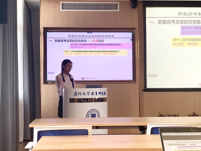 在第二场报告,董照星同学首先为我们回顾了职教高考改革的历史脉络,她指出,职教高考改革在我国主要分为三个阶段,即萌芽阶段(1982-1998年)、探索阶段(1999-2010年)和发展阶段(2011年至今)。接着,她谈到目前职教高考改革仍然面临着非传统生源依赖于“学制式”升学路径、分类考试禁锢于传统的应试之举、综合评价简化为“知识”和“技能”的二维评价和多元录取陷入“一元区分”的窠臼等现实问题。最后,针对职教高考改革中存在的问题,她提出要开发灵活学制的教育与培训项目以吸引优质生源;要根据多元群体的入学需求,探索“因材施考”;要整合“知识+技艺+能力”三维指标,提升考生综合素养;要“招工——招生”同步,动态评估教育与实训全过程的对策建议。报告结束后,师生就“对已有职教高考现状提出的建议是根据什么提出的?”“应该用什么理论来研究这一问题?”等问题与其进行了交流。潘先生在总结环节提到,在研究职教高考改革前首先要考虑一个问题,即为什么职业教育的制度是由国务院制定的,而普通教育是由教育部制定的?潘先生指出,职业教育与普通教育不是两个层次的问题,而是两种制度的问题,职业教育不是低层次的教育,希望董照星同学再加强对这一方面的考虑。