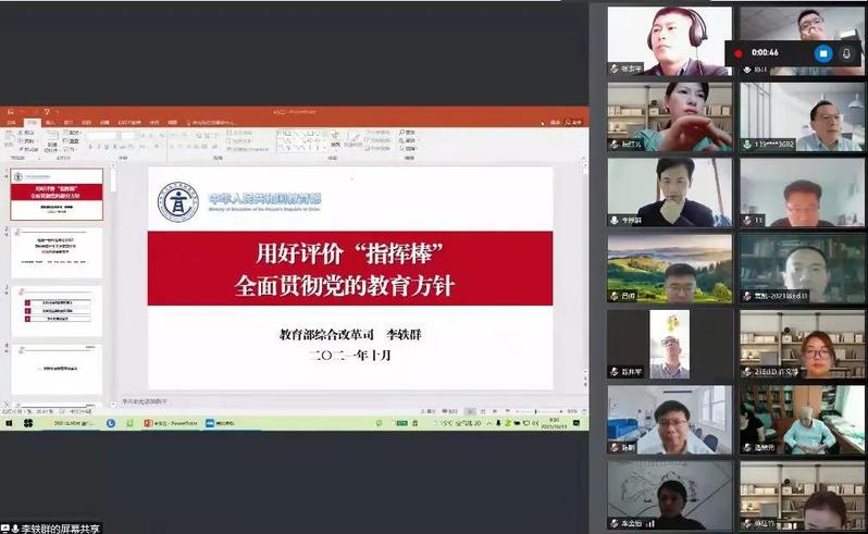 李轶群处长首先从《深化新时代教育评价改革总体方案》出台的背景和意义、文件的主要内容和精神以及文件的贯彻落实三个方面阐述了文件精神。李处长认为,这是新中国第一个关于教育评价系统性改革的文件,其系统性体现在主体、学段、环节、破立、远近和配套等多个方面,涉及面之广、改革力度之大都是空前的。李处长结合文件精神和多所高校的相关案例进一步指出,教育评价改革事关教育发展方向,事关教育治理现代化,事关教育综合改革的动力,事关良好教育环境的构建。李处长指出,习近平总书记关于教育特别是教育评价的重要论述,为深化新时代教育评价改革指明了前进方向,提供了根本遵循。最后,李处长总结道,教育评价是“一把手”工程,面对教育评价改革的复杂性、艰巨性、长期性,各方必须统筹协调,保证将教育评价改革工作稳妥推进、分步到位。