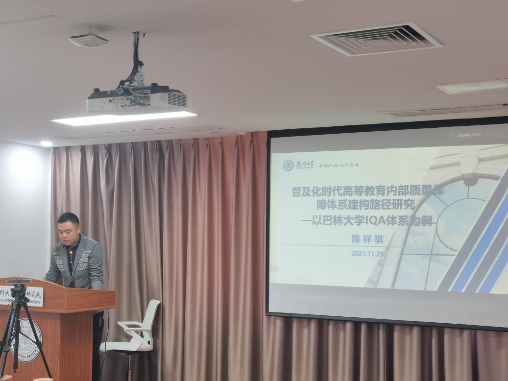 第三场报告是由陈祥祺同学带来的《普及化时代高等教育内部质量保障体系建构路径研究——以巴林大学IQA体系为例》。陈祥祺同学先简要论述了高等教育内部质量研究的意义和以巴林大学内部教育质量保障(IQA)体系为例的缘由。随后,他从管理层次的职责分工、校级质量保障政策和评估执行手册、多元参与的闭环式结构和分类细化的评估内容等方面详细介绍了巴林大学的IQA体系。最后他指出,普及化时代高等教育内部质量保障体系的建构需要明确责任分配,实现多元参与;立足本土需求,构建保障体系;采集数据资料,实施常态监测;筑就质量文化,突显培养职能。在讨论环节,师生就巴林大学IQA体系的评估内容、管理层次、在实施过程中遭遇的问题及解决方案、是否关注学生全面发展及对我国课程教学和绩效评估改革的启发意义等问题展开了互动。在总结环节,潘先生认为该研究以具体实例来剖析多元化的教育质量是值得肯定的、有意义的。