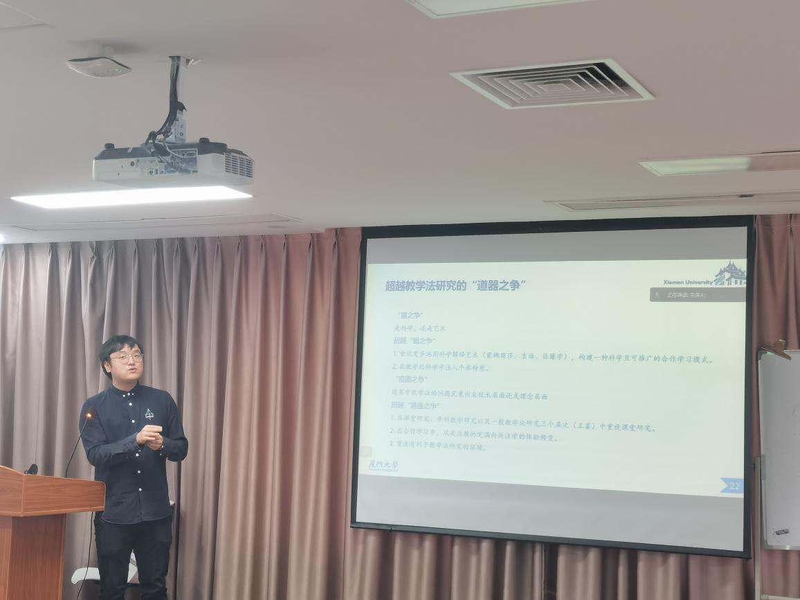 第四场报告是由郭一凡同学带来的《盛名之下其实副否:大学生合作学习的理性审思——兼论合作学习的未来转向》。郭一凡同学从合作学习研究成果日益丰富、相关研究走向深化、获得了实践的典型地位及成为主流观念的现实映照等角度描述了大学生合作学习的现实繁荣。他紧接指出其“完美无瑕”盛名的形成依赖于偏颇的片面叙事、无差别的盲目推广、作为攻击传统教学法的工具和成为教师的场域惯习等原因。大学生合作学习盛名之下还存在着知识技能学习不完整、教师角色模糊、难以有效分组和成绩评价等缺陷。基于对合作学习的批判性思考,他提出未来的合作学习需要融合信息技术,赋予解放意义,追求确定框架下的不确定过程,以及超越教学法研究的道器之争。在讨论环节,师生就合作学习理念和传统学习理念的冲突、合作学习的适用领域与适用前提、合作学习实践困境的解决策略等问题展开了互动。在总结环节,潘先生指出,合作学习是一个很广泛的命题,它的定义是多样化的。在研究初始要先界定合作学习的内涵,然后才能进行深入研究。
