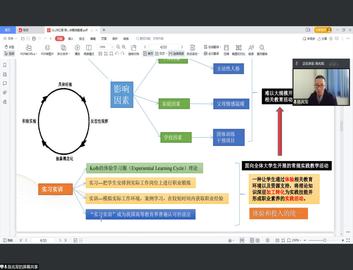 第一场报告是由陈兆军同学带来的《实习实训体验对大学职业决策自我效能感的影响——以民办本科院校为例》。陈兆军同学以大学生就业的重要性为逻辑基点,着力探究实习体验、实习实训投入、与职业决策自我效能感之间的关系。他指出,实习实训作为高校实践育人的重要渠道,能够显著预测大学生的职业决策自我效能感,从而影响大学生的择业信心。因此,高校应充分利用自身的校企融合优势推进实习实训工作,增强大学生职业决策能力和就业能力,以提升人才培养质量。在讨论环节,师生就职业自我效能感的培养路径、实习实训研究的创新价值、实习实训课程设计与实践意义等问题展开了互动。陈兆军同学一一作出了回应,并再次强调实习实训课程对于高校实现内涵式发展有促进作用。