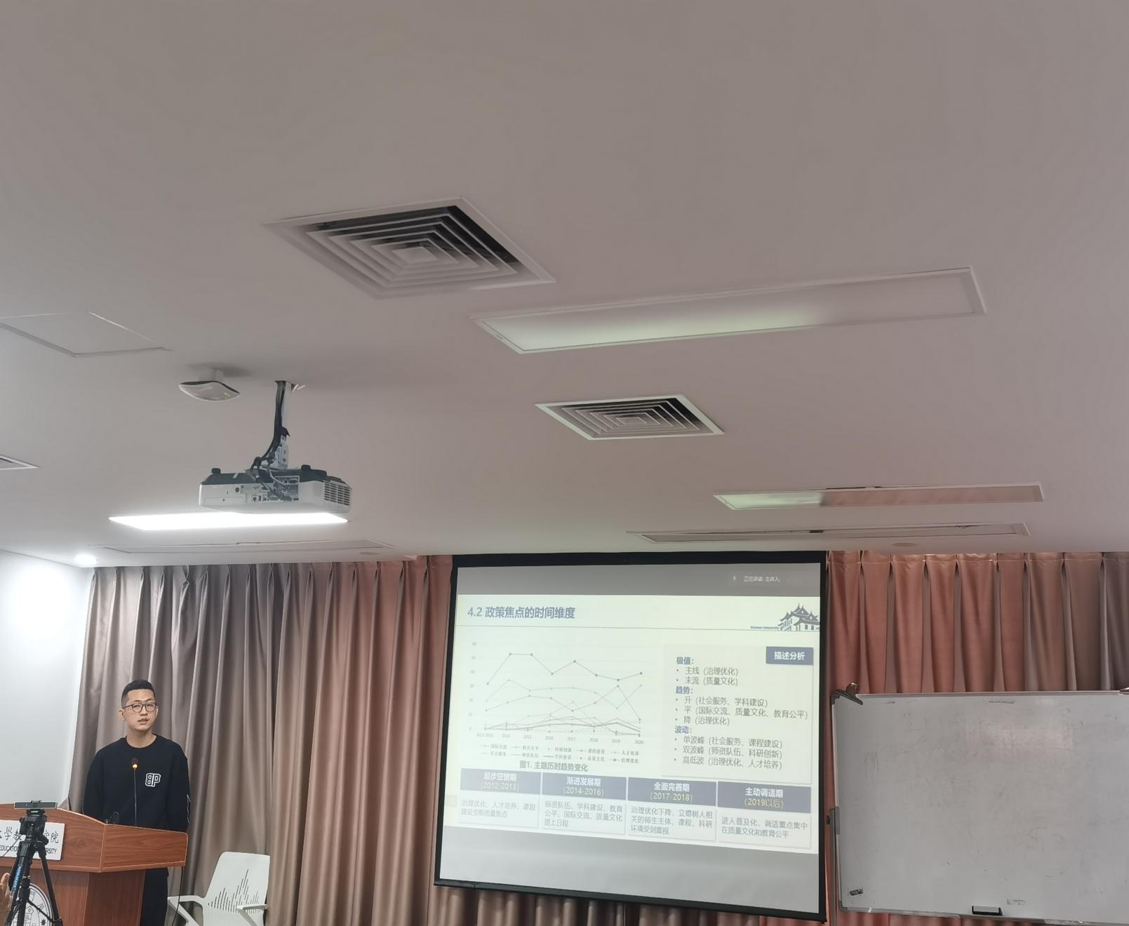 第二场报告是由俞兆达同学带来的《新时代中国高等教育质量政策焦点的质化考察》。俞兆达同学先从价值目标与行动取向、中心主题与偏好分配、历史演进与阶段比较三视角出发,总结了关于高等教育质量政策研究的已有发现。随后,俞兆达同学论述了政策焦点在内容、时间、结构和主体四大维度上的特性。他指出,“质量文化”的相关话语在现行高等教育质量政策焦点谱系中显示度较低,高等教育质量政策焦点呈现出国际交流氛围感不足的现象。因此,我们应当注意高等教育普及化阶段教育公平和质量之间的可能张力。在讨论环节,师生重点就政策焦点中教育质量与国际化关系问题展开互动,并且还有同学对政策焦点中主体维度的三个模式、抽象的质量文化与扎根理论编码策略等问题提出疑问,俞兆达同学对这些问题都作出了详细解答。在总结环节,潘先生作了点评。潘先生指出,质量是多元化的,不同部门对于教育质量的标准也是不同的。因此在进行政策文本分析研究时,不能忽视质量的多元化特性。