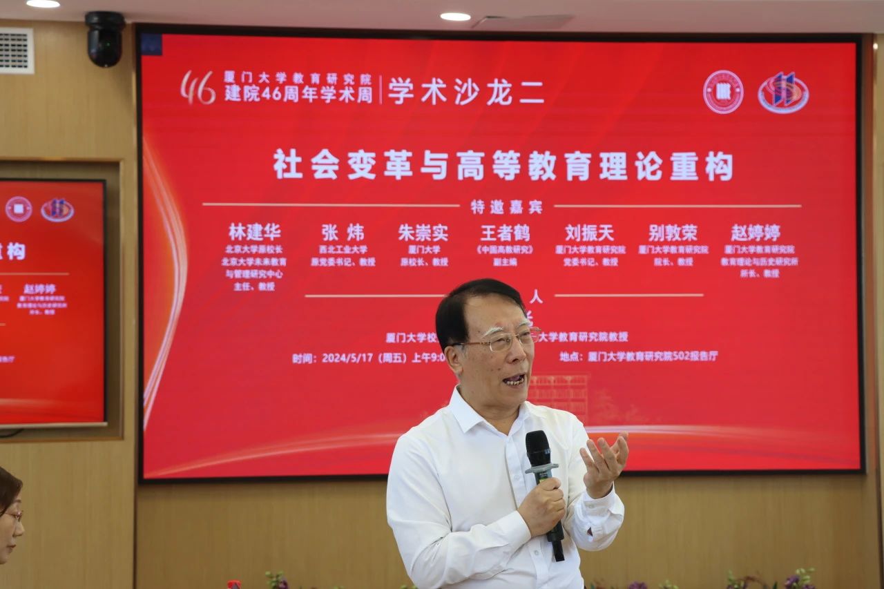 2024年5月17日上午,厦门大学教育研究院建院46周年学术周举行了第二场学术沙龙,沙龙主题是“社会变革与高等教育理论重构”。北京大学原校长、北京大学未来教育与管理研究中心主任林建华教授,西北工业大学原党委书记张炜教授,厦门大学原校长朱崇实教授,《中国高教研究》副主编王者鹤,厦门大学教育研究院党委书记刘振天教授,厦门大学教育研究院院长别敦荣教授,厦门大学教育研究院教育理论与历史研究所所长赵婷婷教授、厦门大学教育研究院鲍威教授等参加了此次沙龙。厦门大学校务委员会副主任、厦门大学教育研究院邬大光教授担任主持。与会专家就数智时代与高等教育观念变革、高等教育普及化与高等教育理论重构、中国高等教育自主知识体系建构等相关主题展开热烈讨论。