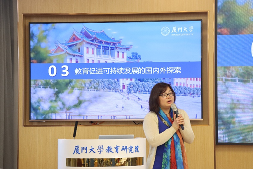 随后,蔡秀英老师结合自身研究和教学经历为大家呈现了国内外探索教育促进可持续发展路径的生动案例,并分享了她对教育促进可持续发展的全球化和本土化思考。她表示,作为实现可持续发展目标的重要环节,可持续发展教育不仅是2020-2030年全球可持续发展框架的重要抓手,更是实现建设更公正和可持续世界的有效途径。这需要全球政府、学习者、教育工作者、青年与广大民众共同努力。报告末尾,蔡秀英老师向大家发出邀请,倡导大家积极探索人与地球的可持续发展教育之道。