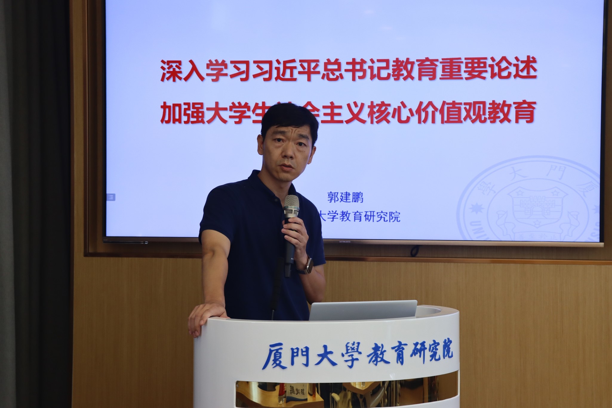 郭建鹏的专题报告主题鲜明,内容丰富。他紧紧围绕习近平总书记关于教育的重要论述,从社会主义核心价值观的道德认同、课程思政、教学投入、教学动机等教育主题模块切入,将学习党的最新理论与中国式教育现代化建设相结合,通过建立模型,引入实证分析,解析了立德和树人的内在联系,用教育学理论阐释了社会主义核心价值观的时代意义,为我们坚持立德树人根本任务,培育和践行社会主义核心价值观提供了理论依据。