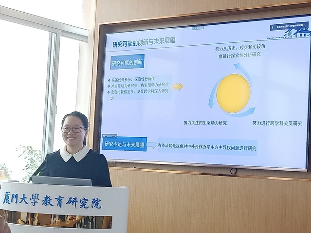 报告伊始,黄敏博士生提出中外合作办学是基于边缘革命的提出、教育对外开放和教育主权意识的提升的时代背景,受中方内生驱动力和外生推动力的交互作用而不断实现发展与变迁的办学形式。从理论逻辑、历史逻辑、实践逻辑和未来发展逻辑四个方面,报告人阐述了中方主动引领从而实现中外合作办学高质量发展的现实路径和中外合作办学中方主导权发展的理论研究设计。基于此,报告人以教育主权理论、战略管理资源基础理论与主体性理论为理论基础,对中外合作办学中方主导权进行历史考察、现实探讨与境外寻经。以中方发展战略为切入点,报告人采用质性研究方法对1301个机构和项目的办学理念、大学章程、战略规划、本科生教学质量报告等进行分析,并结合量化研究方法以全国33所本科及以上中外合作办学大学以及相关项目的学生为样本对中外合作办学资源、战略、绩效、环境关系进行了建模。研究发现,中方发展战略对中方主导权具有方向性引领作用,中方战略模式作为中介对中外办学绩效起到了显著正向预测作用。因此,报告人提出了构建中方主体性发展体系、建设以中为主的控制系统和树立中外合作办学的高质量发展目标的治理对策,总结出掌握中方主导权是中外合作办学的必然趋势、加强中方发展战略管理是进行中方主导权治理的关键等结论。