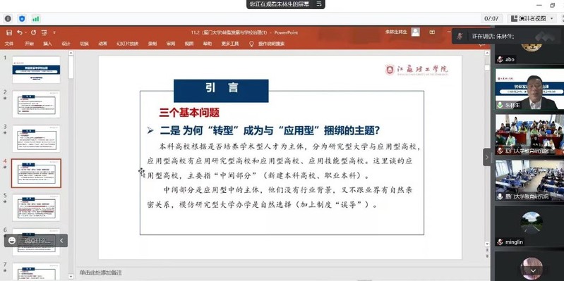 2022年11月7日上午,江苏理工学院党委书记、博士生导师朱林生教授为我院师生作了题为《转型发展与学校治理》的学术报告。别敦荣院长、王洪才副院长、赵婷婷所长等一百余位师生通过线上线下参加了报告会。会议由院党委书记刘振天教授主持。