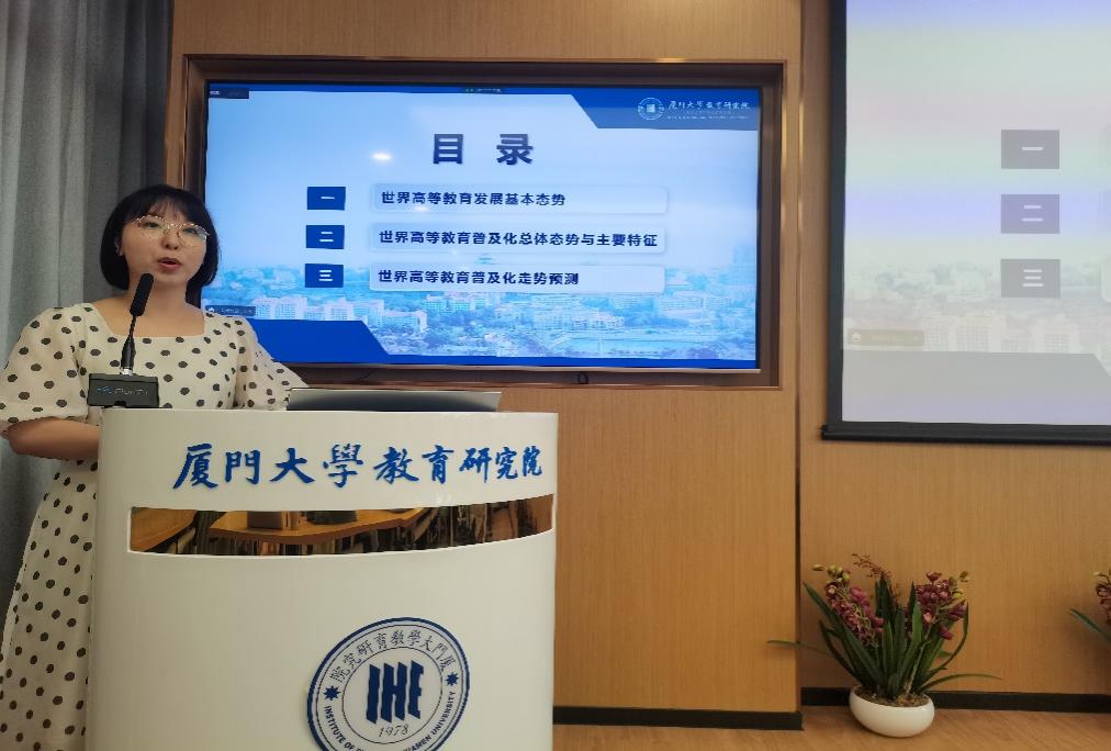 随后,徐冰娜博士后从三个方面对本项研究进行了详细阐述。首先,21世纪以来,世界高等教育发展的基本态势发生了重大转变,世界高等教育地缘格局正在重塑,北美和欧洲区域主导的高等教育发展格局逐渐被打破,发展中国家正成为世界高等教育发展扩张的主力军。其次,世界高等教育普及化总体呈加速发展态势,具体表现在全球巨型高等教育系统的诞生、更包容的高等教育系统的建立、全球人口和劳动力的能力素质及知识化程度的提高等方面。基于此,徐冰娜博士后进一步挖掘了当前世界高等教育普及化的主要特征,包括区域间高等教育普及化进程存在差距、世界高等教育普及化发展与国家社会经济发展水平密切相关等方面。再者,世界普及化高等教育面临着公众求学意愿和需求增加、中等教育普及奠定学力基础以及数字技术拓宽普及化渠道等积极形势,也面临生源难题、资金支持受限以及国际国内政局不稳定等挑战。面向未来,徐冰娜博士后还表示,世界高等教育将呈现出普及化进程全面推进、高等教育地缘格局加速变动等走势。
