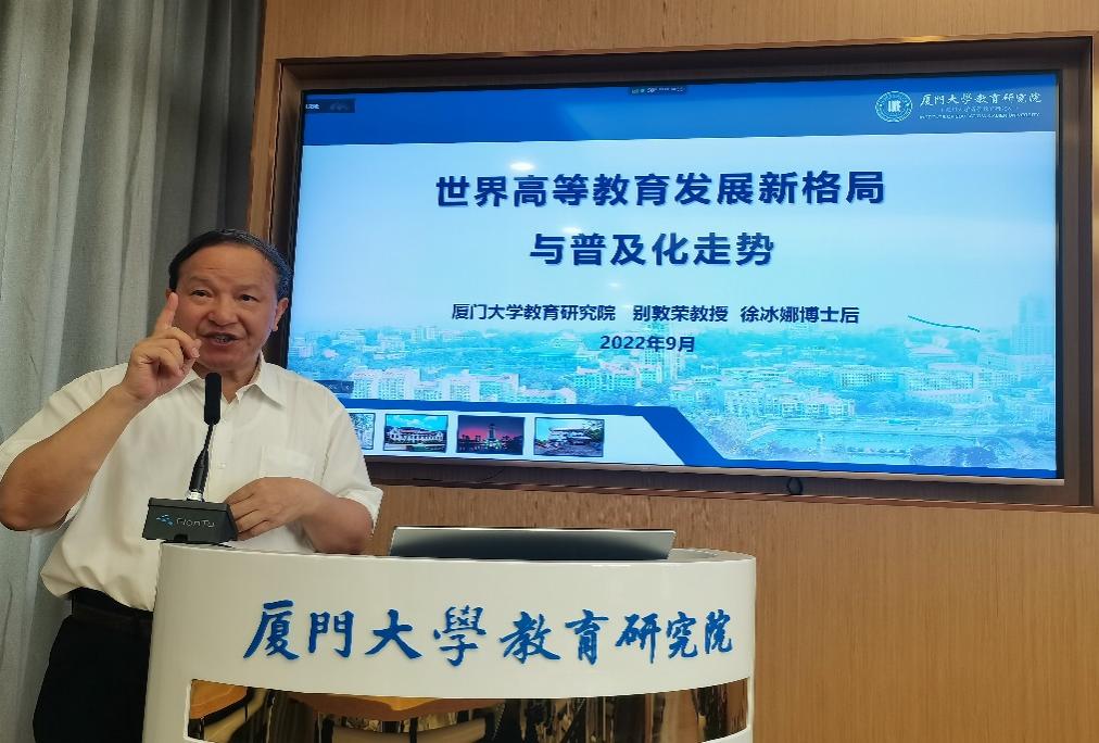 2022年9月19日上午,别敦荣教授、徐冰娜博士后为我院师生作了新学期第一场学术报告,题为《世界高等教育发展新格局与普及化走势》。刘振天书记、邬大光教授等我院师生四百多人通过线上线下相结合的方式参加了此次报告会,同时通过腾讯会议向校内外师生进行直播。徐岚教授主持此次报告会。