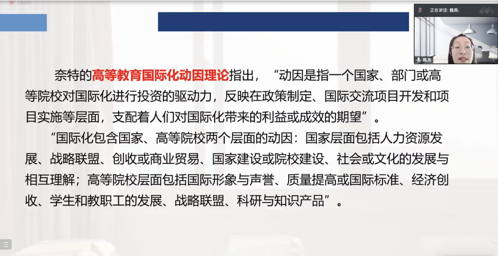 最后一场报告是由魏燕同学带来的《伊朗高等教育国际化态势研究》,报告从伊朗高等教育国际化动因、国际化发展路径以及面临的挑战等方面为与会师生描绘了伊朗高等教育国际化发展的全景视图。报告伊始,她从伊朗在中国“一带一路”建设中的作用出发,引出伊朗高等教育国际化发展的目标与愿景,包括以抵制强权势力、实现民族复兴作为教育的重要使命,坚持教育为国家建设服务,将高等教育作为国家优先发展的方向等。接着,魏燕同学以奈特的高等教育国际化动因理论为依据,将伊朗高等教育国际化的动因归纳为以下四点:第一,追求科学与研究的卓越,满足大学发展的需求;第二,能源经济转向知识经济,适应本国发展模式转型战略;第三,扩大地区教育与科技影响力,维护本地地缘政治利益;第四,弘扬伊斯兰文化,扩大什叶派宗教网络。最后,她从扩大学生流动、加强与其他国家的科研合作以及以宗教教育国际化提升国家软实力等角度论述了伊朗高等教育国际化发展路径,并总结了其高等教育国际化所面临的种种挑战。