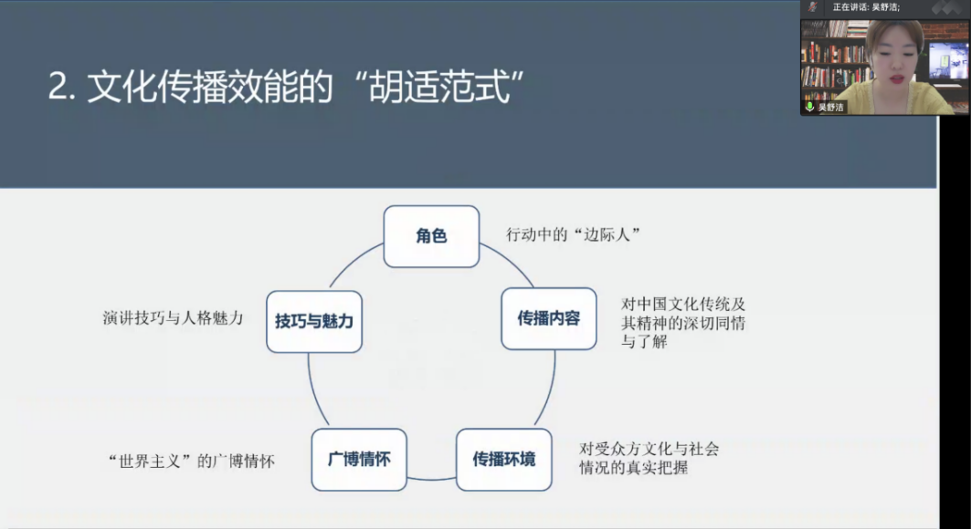 第二场报告是由吴舒洁同学带来的《胡适英文演讲的启蒙价值与文化传播学意义》,报告基于跨学科视角阐述了胡适英文演讲的启蒙价值及文化传播学意义。首先,吴舒洁同学以胡适英文演讲的历史意义为切入点,指出胡适对中国文化精神的“西式”解读,有助于化解西方偏见,唤醒与确立国人的文化自尊与自信。接着,采用文本分析的方法总结了胡适英文演讲渗透出的启蒙价值,包括科学精神、自由民主、人文主义以及与时俱进。最后,从人物角色、传播内容、传播环境、广博情怀以及技巧与魅力五个维度深度挖掘“胡适范式”的文化传播学效能,并指出新时代中华文化的对外传播,需要立足中国特征,增强中华文化认同,进一步提升国际交流中的话语权,积极构建中华文化对外传播的新路径。