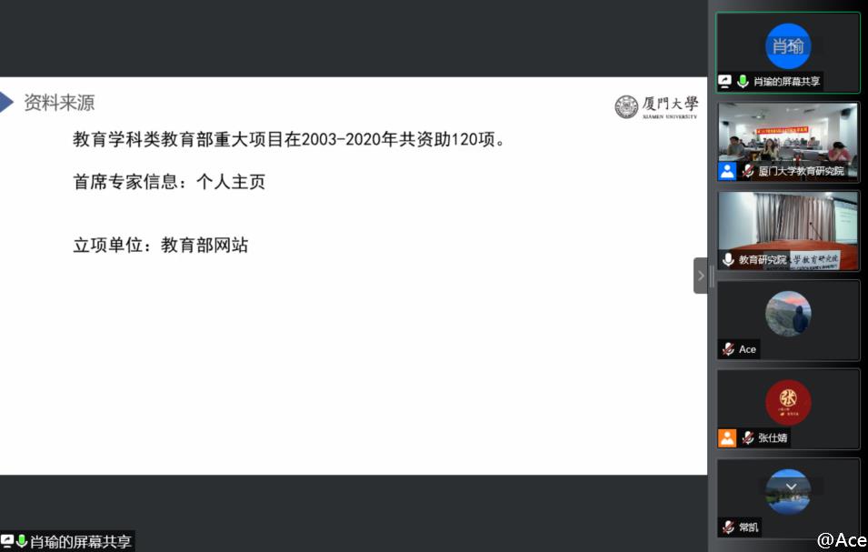 2021级博士生肖瑜(线上)作题为《近二十年来我国教育学研究发展的实证分析——基于2003-2020年教育学科类教育部重大攻关项目》的报告。报告采用文本分析的研究方法,从重大攻关项目首席专家与立项单位、研究内容与研究热点等方面分析近二十年来我国教育学研究的总体特点和发展趋势。