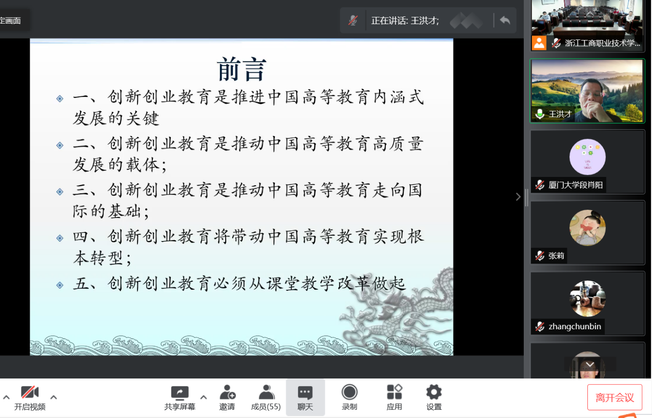 2022年4月12日下午,我院王洪才教授应邀为浙江工商职业技术学院教师作题为“开展探究式教学改革是推进创新创业教育的根本对策”的学术报告。根据疫情防控要求,本次报告会采取线上线下结合的方法进行。浙江工商职业技术学院副校长徐盈群主持报告,浙江工商职业技术学院部分校领导、教务处领导、各二级学院的院长、各专业主任,共计二十余人在校内集中收看线上报告,浙江工商职业技术学院的其他教师、厦门大学硕博研究生共计五十余人通过网络自主收看报告。