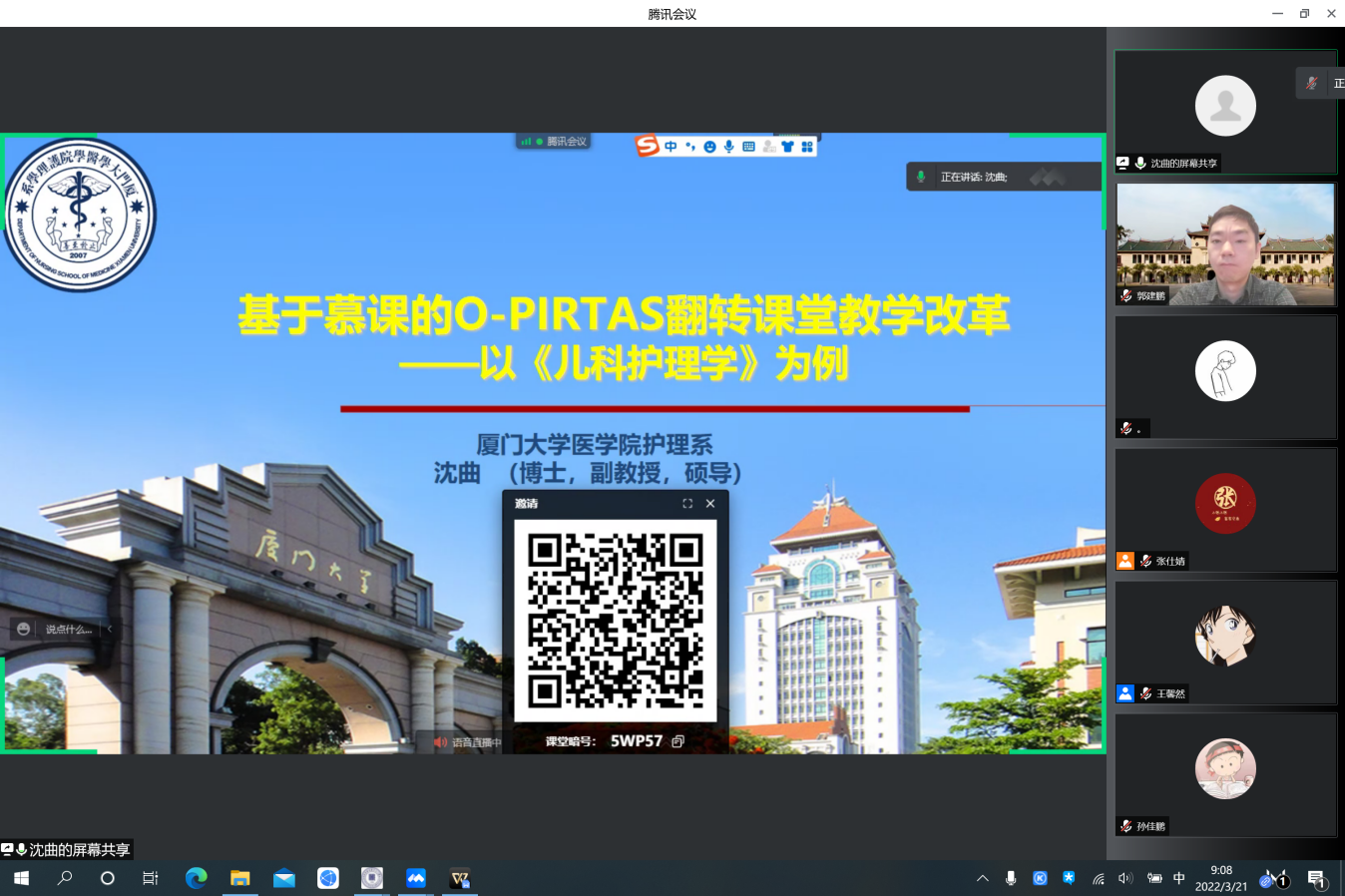 2022年3月21日上午,厦门大学医学院沈曲副教授为我院师生作题为“基于慕课的O-PIRTAS翻转课堂教学改革——以《儿科护理学》为例”的学术报告。师生通过线上的方式参加了此次报告会,郭建鹏教授主持此次报告会。