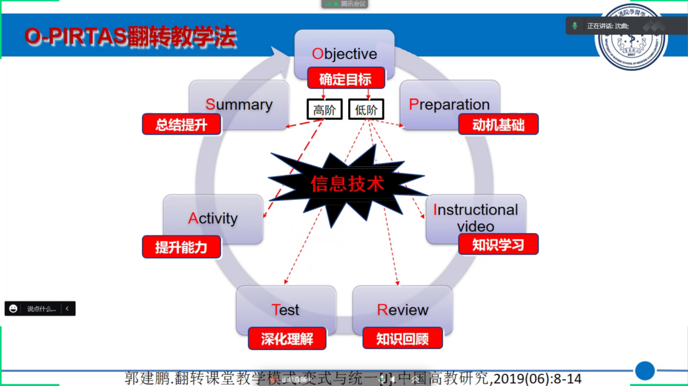 最后,沈老师详细介绍了O-PIRTAS翻转课堂模式,并以亲身主持的《儿科护理学》翻转教学为例,清晰地呈现理论模式转化为实践操作的过程。O-PIRTAS分别指的是目标(Objective)、准备(Preparation)、教学视频(Instructional video)、回顾(Review)、测试(Test)、活动(Activity)和总结(Summary)。沈老师指出,O-PIRTAS模式的每一个环节都有独特作用且是相互联系的。其中,在目标环节的教学高低阶目标区分以及在活动环节的课堂活动设计对翻转课堂的成效和学生能力的培养作用尤为关键。她还强调,评价指标是翻转课堂能否顺利实施的关键要素,因此,教师在教学设计时要将过程性评价融入到翻转课堂的每一环节。除此之外,学生的教学反馈,学习目标、任务目标和考核目标的细化,以及雨课堂、慕课堂等信息技术的使用都有助于翻转课堂教学效果的提高。