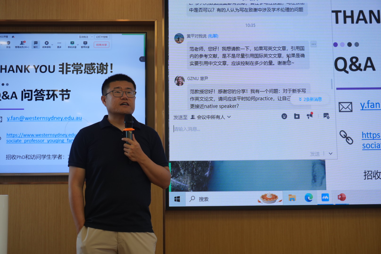 2024年10月14日上午,澳洲西悉尼大学商学院范酉庆副教授为我院师生作了题为《从编辑角度谈谈如何在SSCI一区期刊投稿并发表高水平研究论文》的学术报告。来自全国各高校的400余名师生线上线下参会。