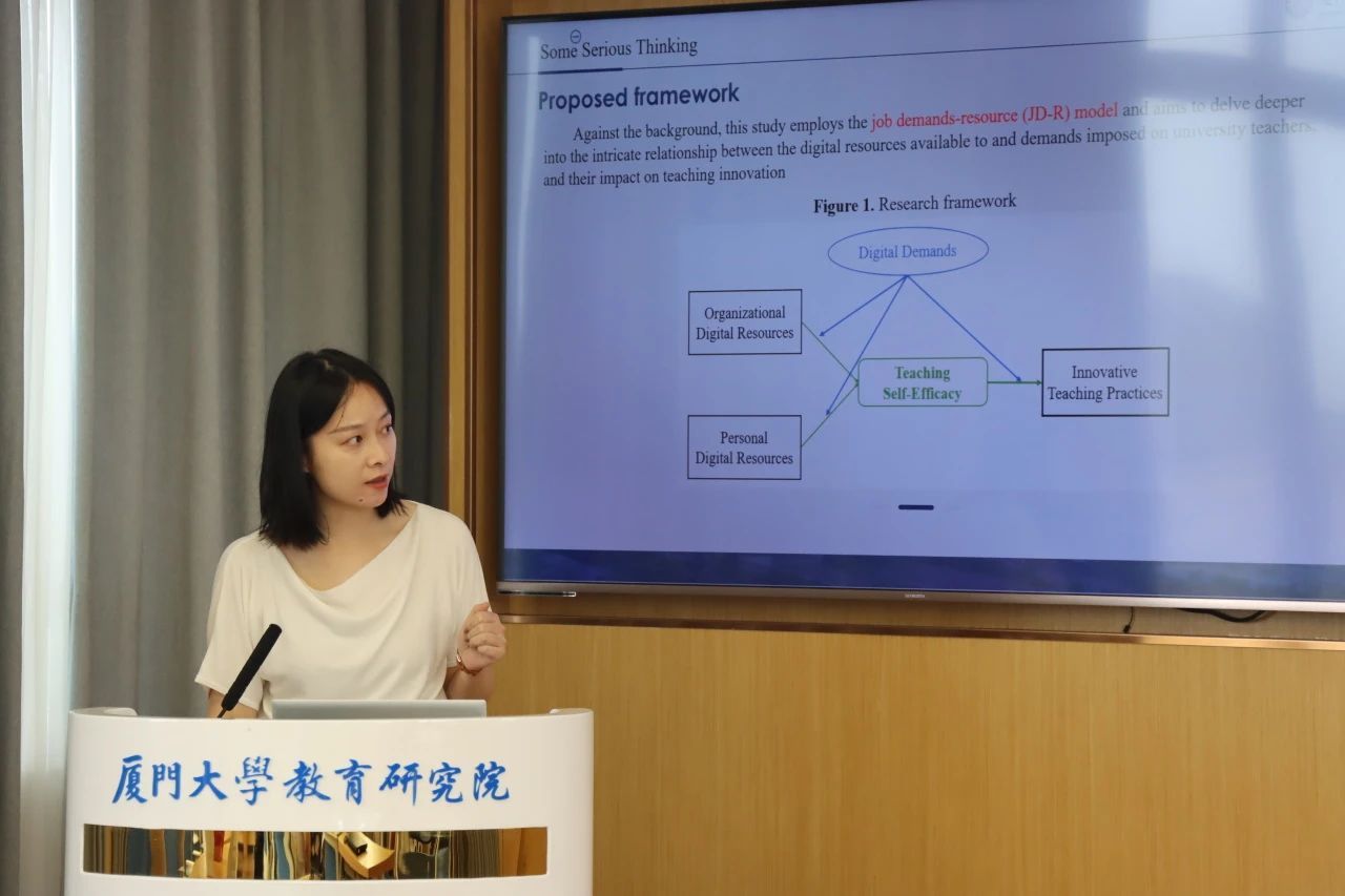 最后,黄依梵副教授和杨梓助理教授的报告基于“工作需求–资源模型”扩展研究,分析了数字时代高校教师教学创新的影响因素。研究指出,教学创新不仅受到技术工具与培训资源的激励,也受到教学负荷与评估压力的制约。教师的自我效能感、组织支持与数字素养被证明是推动创新教学实践的关键资源。