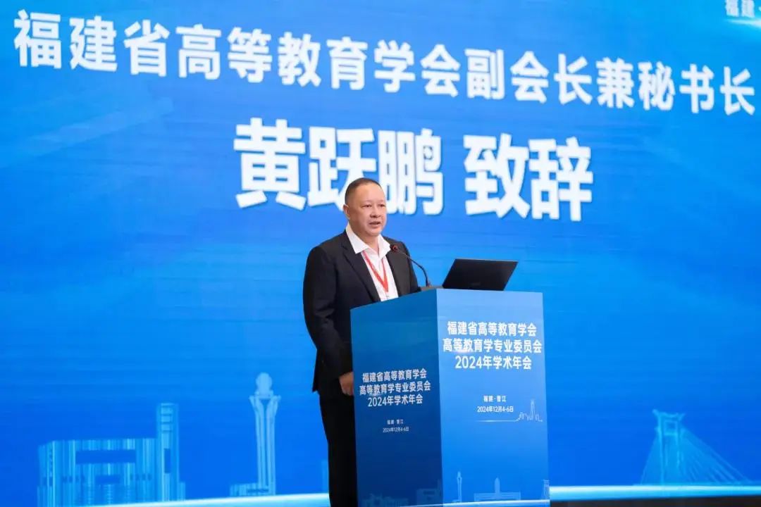 福建省高等教育学会副会长兼秘书长黄跃鹏致辞。他强调,数智化已成为引领高等教育转型升级和重塑高等教育发展优势的重要方式,本次年会以此为题,是要进一步凝聚高校智慧共识,推动高等教育数字化转型,为福建省高等教育数字化发展带来创新思路与策略。