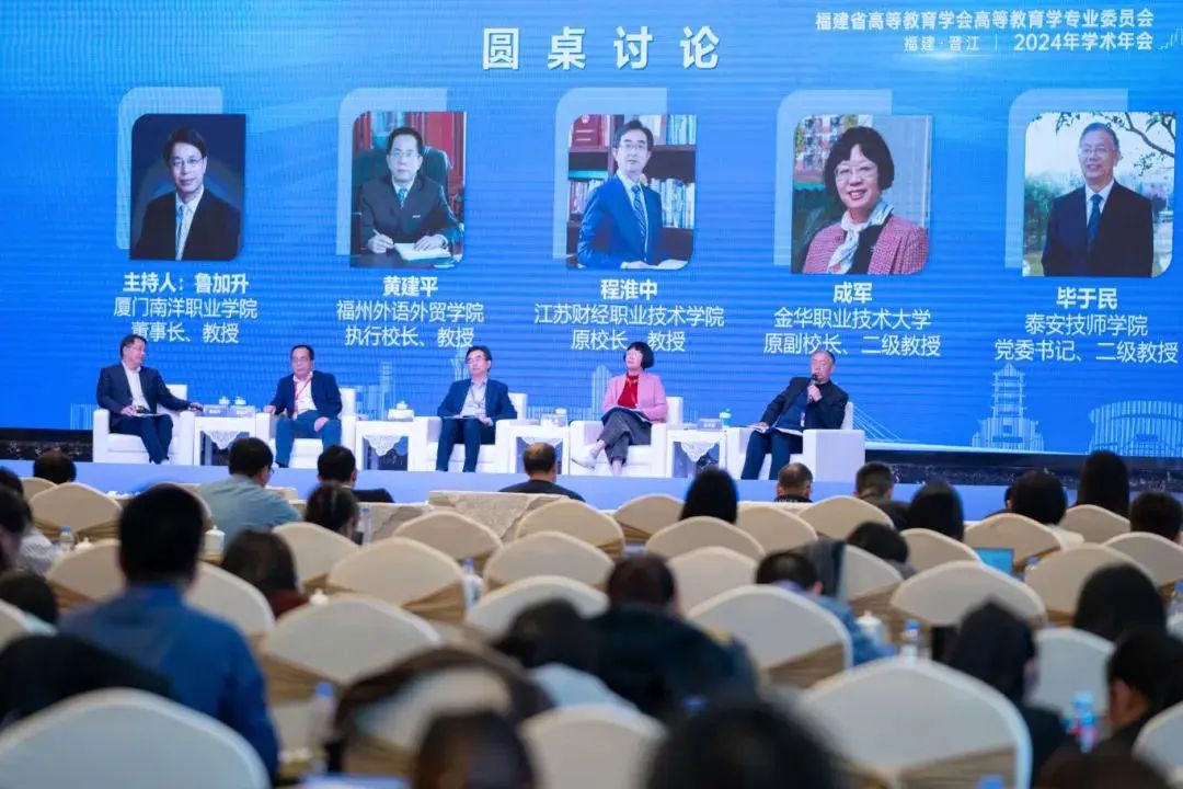 主论坛的圆桌讨论环节,由福建省高等教育学会高等教育学专业委员会副理事长、厦门南洋职业学院董事长鲁加升教授主持。福州外语外贸学院执行校长黄建平教授、江苏财经职业技术学院原校长程淮中教授、金华职业技术大学原副校长成军教授、泰安技师学院党委书记毕于民教授等4位嘉宾,围绕“数智化与高等教育变茧挑战、前景与策略”的主题,进行了交流讨论。
