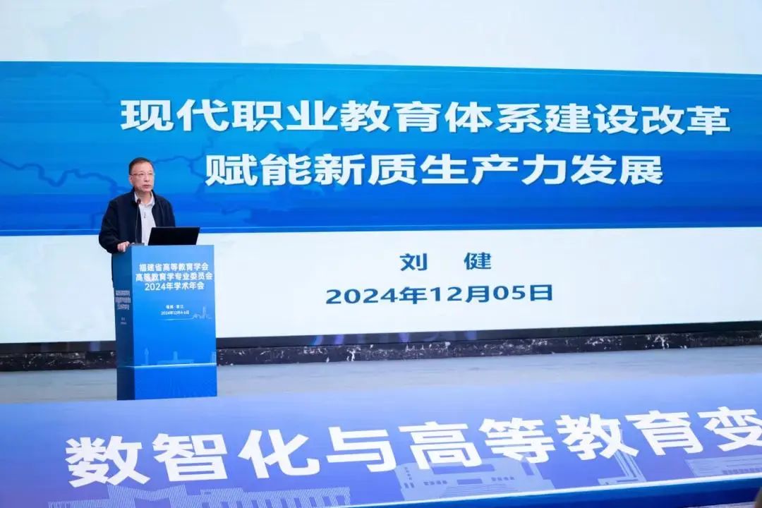 政协第十三届福建省委员会委员、教科卫体委员会副主任,福建省教育厅原副厅长(正厅长级)刘健教授作了题为“深化现代职业教育体系建设改革赋能新质生产力发展”的报告。他从新质生产力的内涵与基本特征、现代职业教育体系建设的运行逻辑和推进路径等方面进行了深入分析。他指出,新质生产力发展是推动高质量发展的内在要求和重要着力点,现代职业教育要适应生产力新质态变化,以产业需求为导向,科学设置专业并实施动态调整,以产教融合为支撑,组建专业群优化课程结构,强化师资队伍建设,培养更多适应新质生产力需求的高素质劳动者和高技能人才。