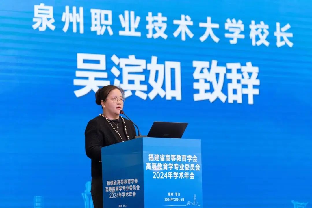 在开幕式环节致辞的嘉宾有三位。福建省高等教育学会高等教育学专业委员会副理事长、泉州职业技术大学校长吴滨如作为承办方致辞。吴校长指出,晋江城市发展、产业繁荣与职业教育高质量发展共生共荣、同频共振,泉州职业技术大学致力于建设产业伙伴型大学,以扎实推动产教城融合为己任,期待大家晋江之行收获满满。