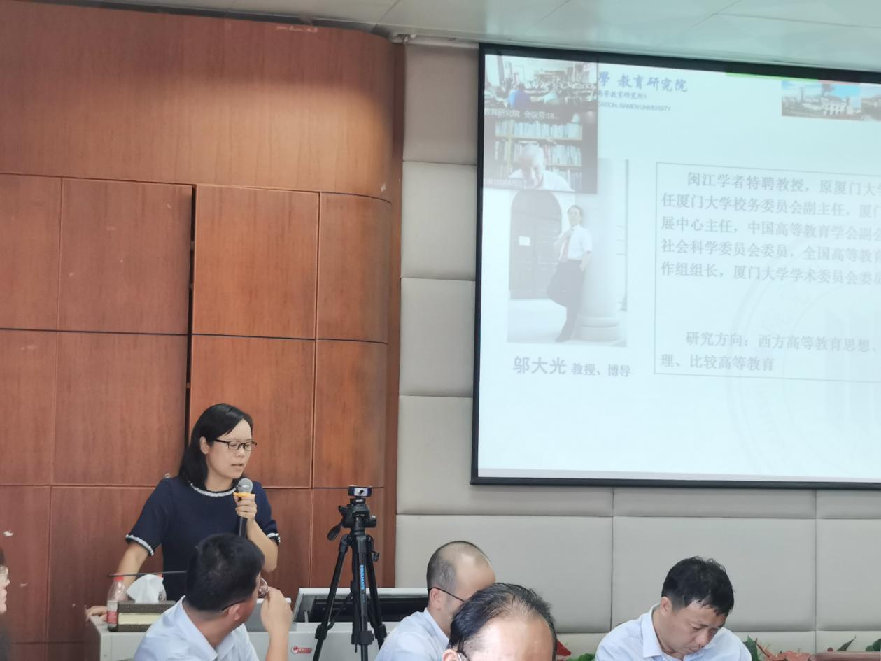 紧接着,郑冰冰书记与新生们分享了她从六月到九月的心情转换,六月是惆怅的,因为送走一批共同交往生活了几年的毕业生;九月是兴奋的,因为学院迎来了七十多个朝气蓬勃的研究生新生,她看到了高等教育研究队伍的再次壮大。同时,郑冰冰书记提出在中国高等教育普及化的背景下,高等教育人才的培养非常重要,教育研究院师生都肩负着关键重担。郑冰冰书记寄语我院硕博研究生能够学习潘懋元先生的学术信念、学术品格和学术精神,在这座高等教育研究重镇里,引领创造无数个“第一”。她嘱咐同学们要掌握扎实的知识基础,把握正确的思想方向,要有前瞻性的科研目光和能力,开展又红又专的学习生涯。最后,郑冰冰书记祝福各位同学学业进步、思想进步,既要有严肃紧张的学习也要有愉快活泼的生活。