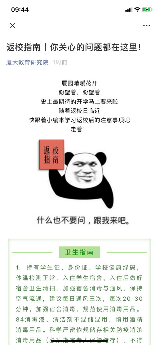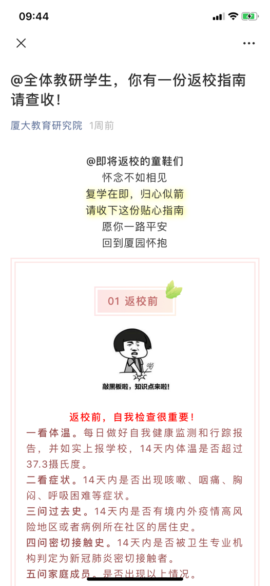 为帮助同学们准确掌握返校相关信息与要求,提高同学们返校途中的防护意识,提前了解学校关于返校后校园生活的各项信息,教育研究院通过微信公众平台及时推送与返校信息相关文章5篇,涵盖返校通知、返校指南、返校后注意事项、宿舍卫生安全等多个方面内容。系列推送得到了全院师生的认可,师生广泛阅读、转发并学习,在全力搭建师生校园生活的信息堡垒,助力返校工作顺利进行的同时,也扩大我院对外宣传平台的影响力。