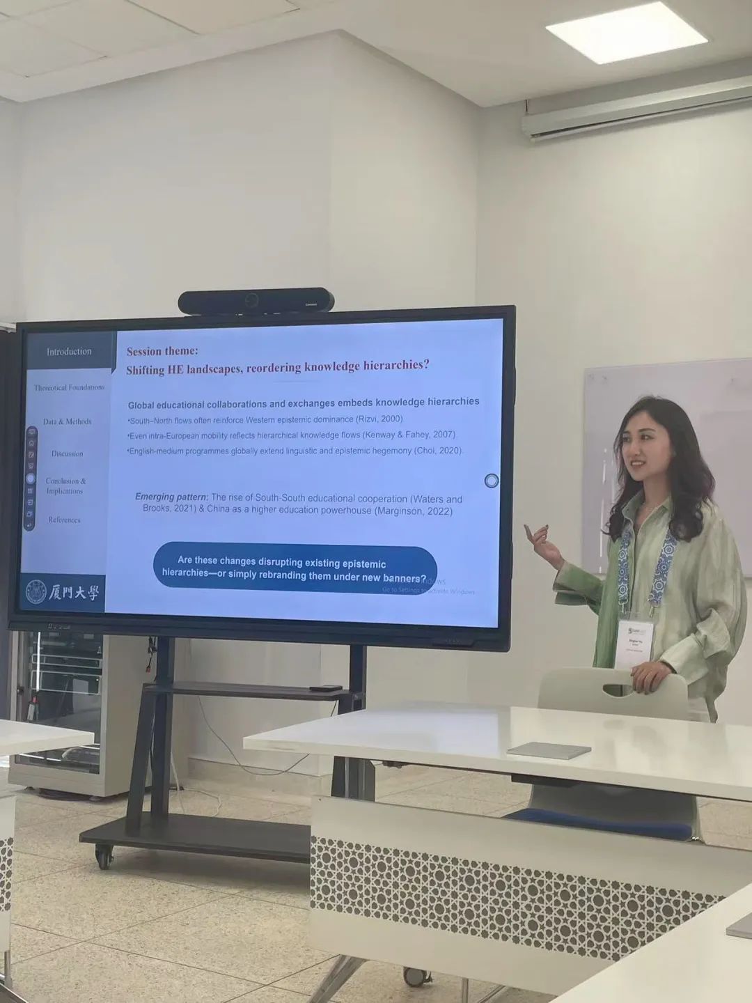 同日下午,余婧然在由牛津大学Rachel Brooks教授与萨里大学Vera Spangler教授联合组织的小组论坛“国际学生流动与知识秩序的争夺”(International Student Mobility and Contested Knowledges)中,报告了题为“Competing Imaginaries and Renegotiating Knowledge Hierarchies: International Student Experiences and Perceptions at a Chinese Branch Campus in Malaysia”的会议论文。该研究基于在厦大马来西亚分校的田野调查数据,在知识地缘政治的理论透镜下深入分析了国际学生在后殖民语境中协商、回应乃至重构以西方为中心的知识等级秩序的能动性策略。报告回应了本届年会关于知识正义的核心议题,获得了与会学者的积极回应与深入讨论。此次参会不仅展示了中心学者在社会学与跨境高等教育研究中的理论探索与实证积累,也进一步加强了中心与社会学跨学科全球研究网络的交流合作。