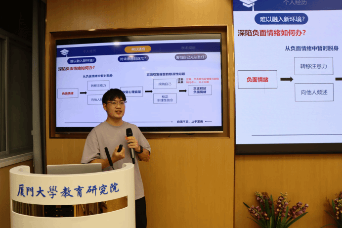王仕超同学结合个人经历,从环境适应和学术规划两方面展开分享“如何适应并规划研究生阶段的学术与生活”。他谈到了研究生阶段有可能面临的三大难题:难以融入新环境、学业挑战以及对未来感到迷茫。随后,他从多个维度给予了同学们发展建议,针对适应期间可能面临的负面情绪,他提出可以通过转移注意力或向他人倾诉的方式缓解,恢复心理能量后再直面引发痛苦的根源性问题,以接纳自己、矫正非理性信念等方式真正释放负面情绪。最后,他从课程修读、论文发表、导生合作以及毕业论文设计四个方面切入,为大家提供了多样化的学术规划思路。