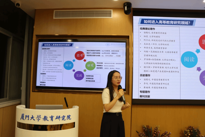 易梦春老师带来《跨学科起航:高等教育研究的入门之路》主题分享。她以自身跨学科经历为引,对2025级硕博新生的跨学科背景进行画像,围绕三点展开阐述:第一,高等教育学研究什么?她指出高等教育学是研究高等教育的特殊问题、揭示高等教育基本规律的科学,包含多个研究领域,不同的视角切入涉及到不同的研究问题。第二,如何进入高等教育研究领域?她鼓励同学们将阅读、思考、研究与交流四个方面相结合,强调了历史视角与比较视角在研究中的重要性。第三,如何利用自己的跨学科背景?“不要抛弃你的来处,而要把它变成你在新领域的立足点。”高等教育学作为一门交叉学科,她鼓励大家从跨学科视角出发,迁移自己的专业知识与能力,培养独特的问题意识,找到差异化的研究点。