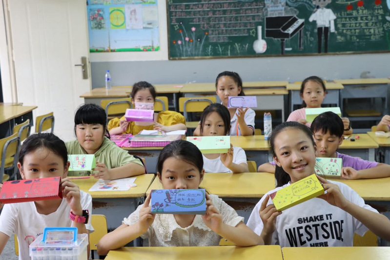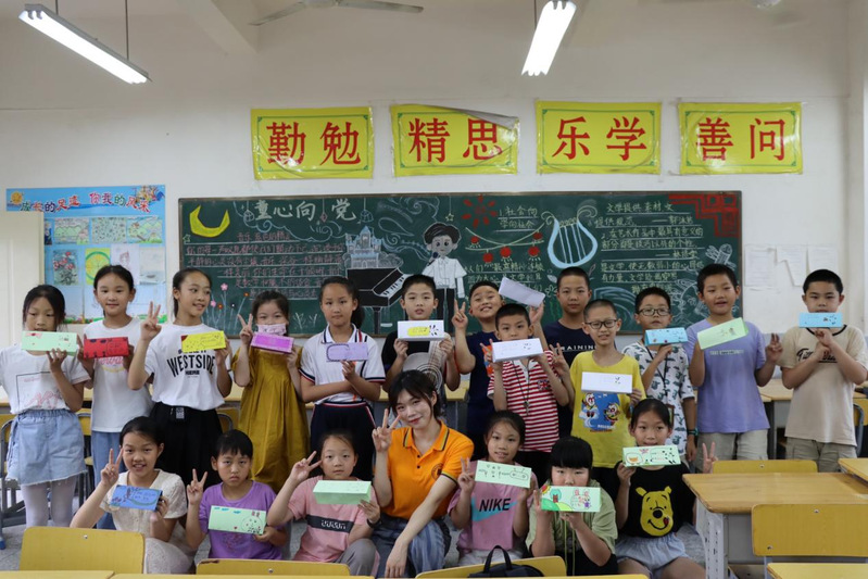 6月29日下午实践队成员揭雨晨、李文婷了带来趣味纷呈的手工课,队员张靖佶、孙略带来了别开生面的英语课。手工课上,在队员的指导下,同学们在五颜六色的卡纸上画出自己喜欢的各种图案,接着写上自己的姓名与班级,制作出属于自己的独特姓名牌,孩子们充分运用自己的想象力,完成了一件件精美的成品,体会到了动手创作的快乐。紧接着,同学们迎来了期盼已久的趣味英语课。在课上,队员们制作的精美英语课件“My Favorite Fruit”深深吸引了学生们的眼球,在教授水果英文单词的同时,通过单词竞赛和“萝卜蹲”的小游戏,带领同学们在欢声笑语中学会了许多陌生的水果类英文单词及一些常用英语句式。