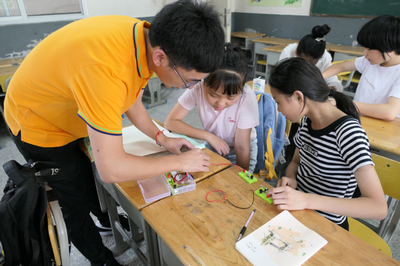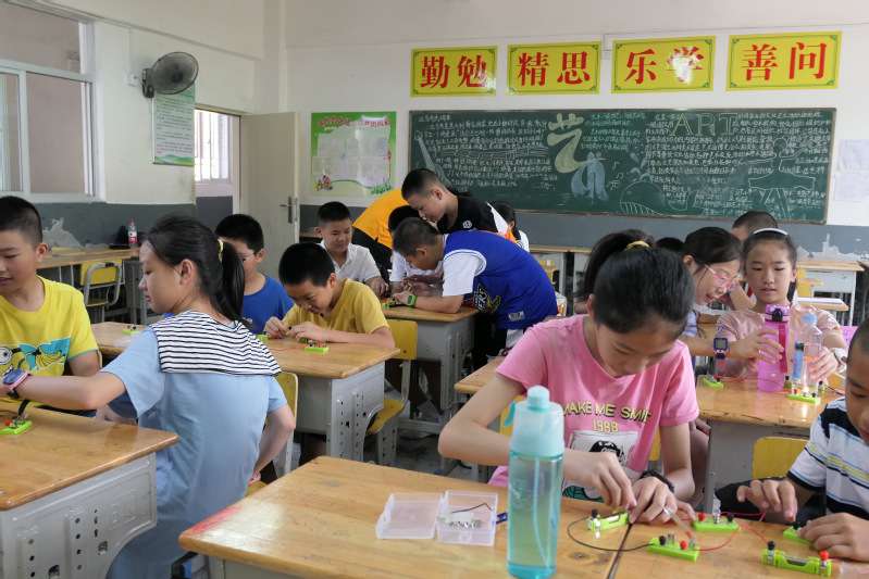 又是一个阳光明媚的早晨,“榕树厦”实践队成员们迎来了第五天的支教活动。7月2日上午八点三十分,学生们期待已久的趣味科学课和数学课如约而至。趣味科学实验由实践队队员孙略主讲,在一步步的启发和指导下,学生们都成功地使用电池、导线、开关等材料点亮了小灯泡。在自主学习和自主探索的过程中,学生们学习了简单电路的基本知识,了解了电路构成的基本元素与基本形式,通过观察电路通断、灯泡明暗等实验现象激发了学习兴趣与积极性。最后,针对本节课的实验内容,还组织了奖品丰富的知识竞答环节,同学们踊跃地参与到问题抢答中,现场氛围十分热烈。通过本次的趣味科学实验,让登俊小学的同学们感受到了成功点亮小灯泡的喜悦,也体会到了科学探索的乐趣,并在实验过程中锻炼了不怕失败、大胆探究、敢于创新的科学态度。