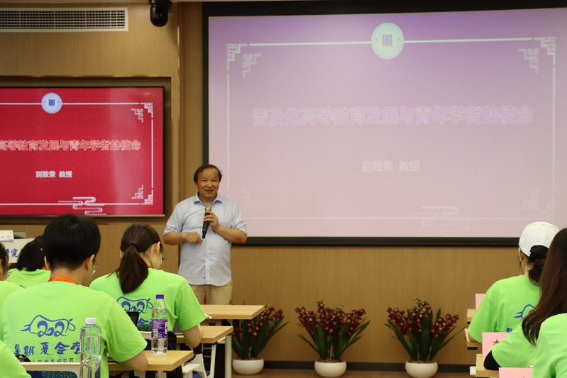 2021年7月12日,夏令营第一天,别敦荣院长在院502报告厅为夏令营营员们作学院整体介绍并作题为《普及化高等教育发展与青年学者的使命》的学术报告。