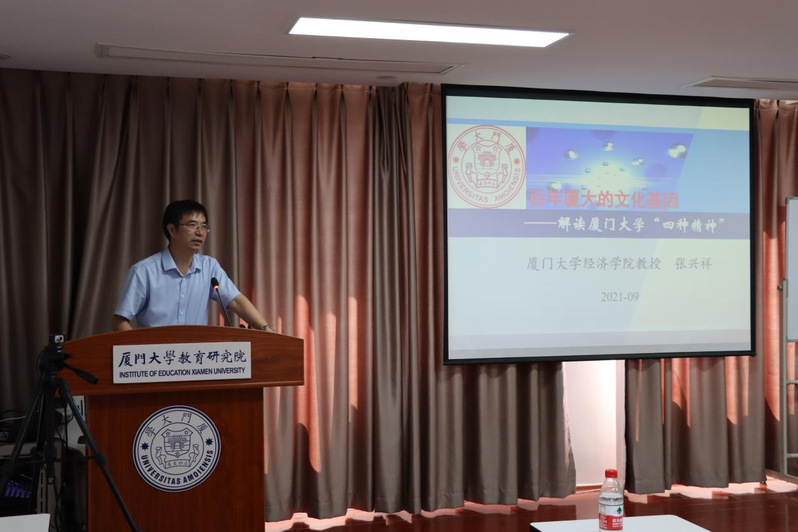 为了帮助各位新生继承发扬厦大“四种精神”,激发爱校荣校情怀,厦门大学经济学院张兴祥教授受邀为新生作了主题为“百年厦大的文化基因——解读厦门大学‘四种精神’”的校史校情专题讲座。他分别从历史背景、核心内涵、人物事迹等角度生动地向同学们诠释了陈嘉庚先生的爱国精神、罗扬才烈士的革命精神、以萨本栋校长为代表的艰苦办学的自强精神和以王亚南校长、陈景润教授为代表的科学精神的丰富内涵,他强调这四种精神是厦门大学在百年的优良办学历史中所形成的独特的文化基因,应当薪火相传,并以此激励同学们自强不息、开拓创新,不断取得新成绩、新成就、新发展。