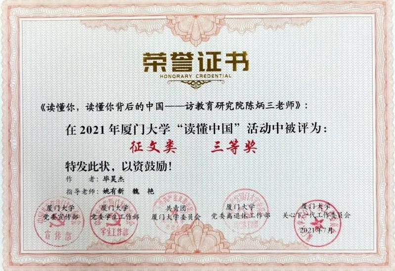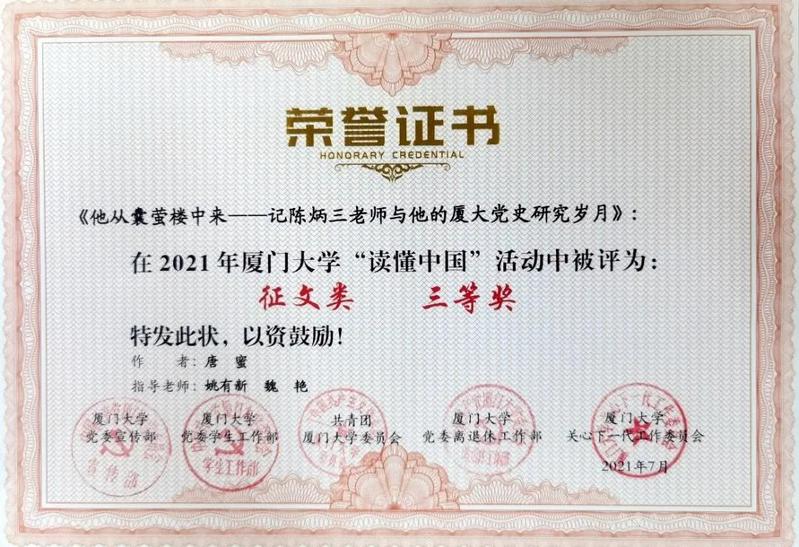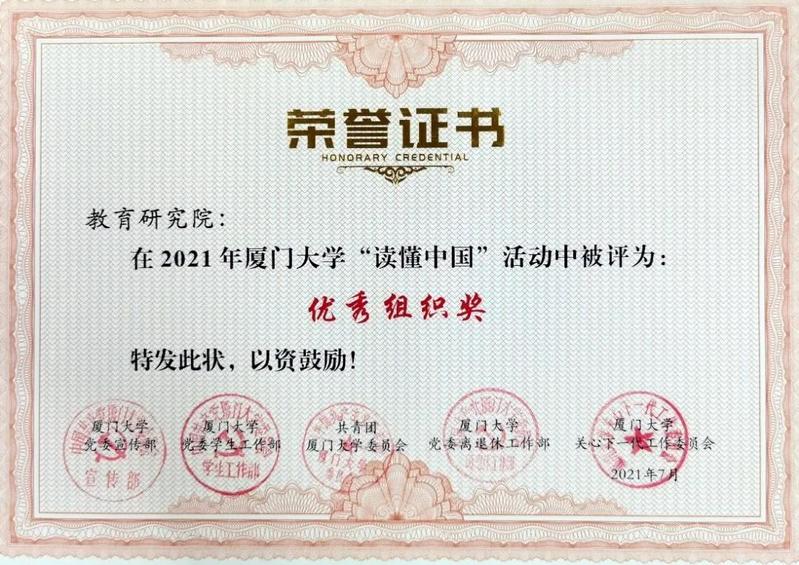 此外,我院2020级硕士生毕昊杰、唐蜜的征文作品分别获得了厦门大学2021年“读懂中国”征文组三等奖,我院还获得了优秀组织奖。
