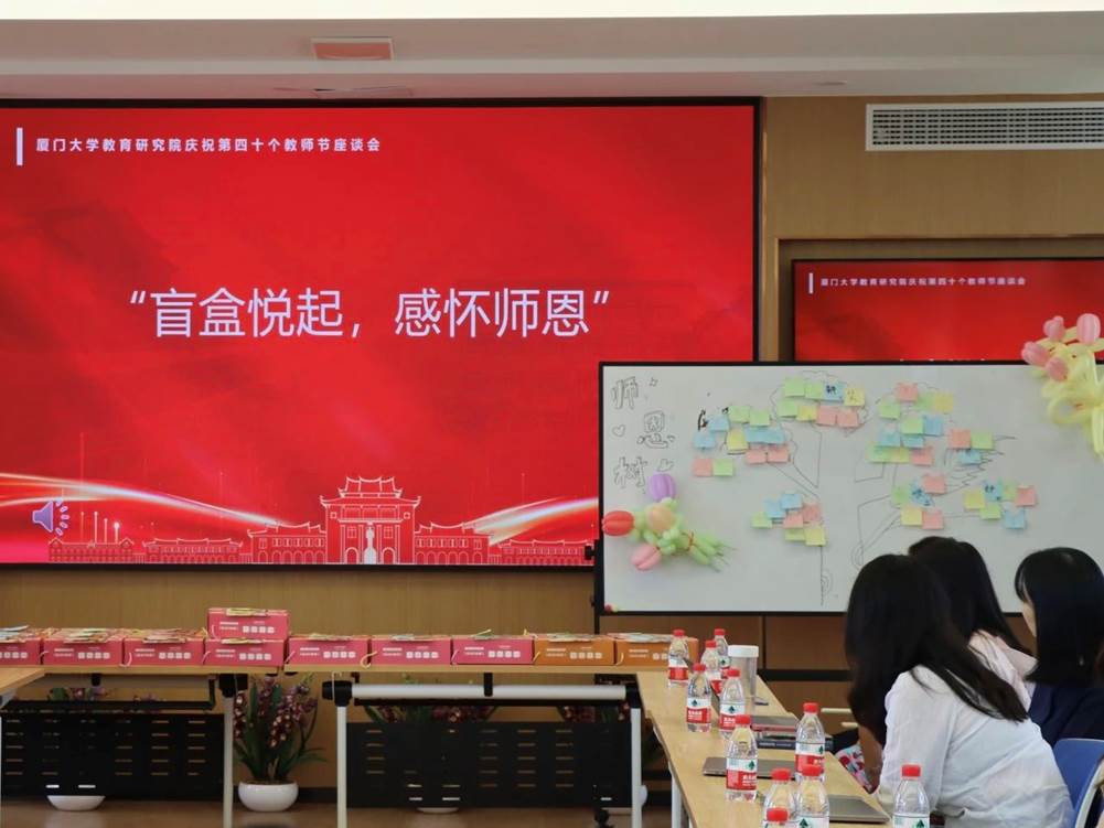 在座谈会“彩蛋”环节,教育研究院团总支、研究生会的同学们精心策划了“盲盒悦起•感怀师恩”师生互动小游戏,向老师们表达节日祝福和感恩之情,座谈会在同学们精心准备的贺卡和老师们开盲盒、喜提一枚彩色“锤子”的小惊喜中圆满结束。