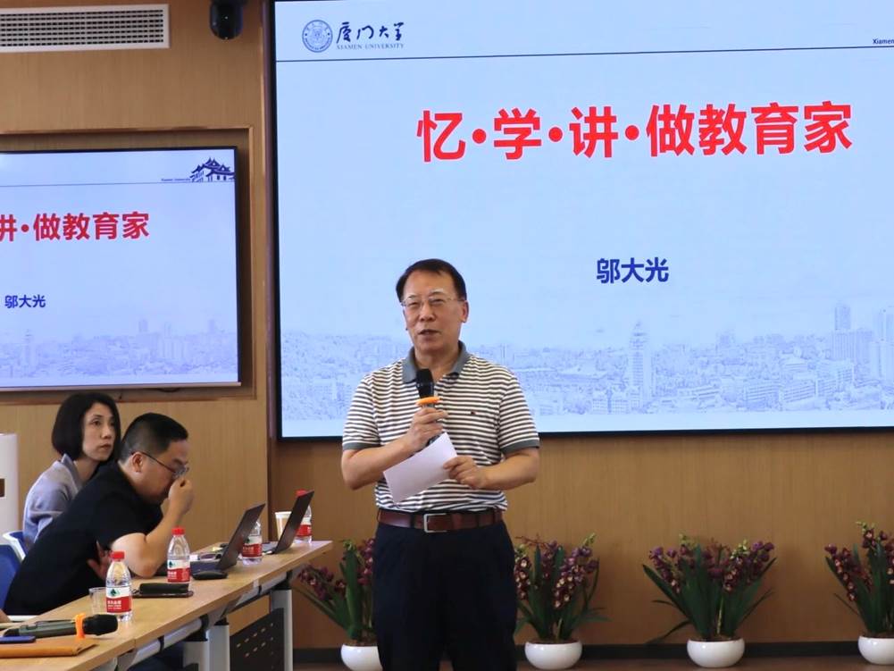 随后,中心邬大光教授以《忆·学·讲·做教育家》为题,与大家分享了自己从小学生到博士生求学经历中与老师们的点滴趣事,特别是他与潘懋元先生的故事,引起现场师生的共鸣,潘懋元先生的大师风范,使与会师生更加深刻地感悟“什么是好老师、怎么做好老师”的真谛。邬大光教授认为,要区分“教育家”“教育思想家”以及“高等教育研究专家”的不同内涵,他认为,对教育家的理解和工作标准应该有四点:一是教育家爱学生要超过爱自己的孩子;二是以身作则,要求学生做到的事自己要先做到;三是老师既要留下有字之书,也要留下无字之书;四是老师不仅要看到学生的进步,还要让学生看到老师的进步。他以这四点要求勉励师生要以躬耕态度弘扬教育家精神,为强国建设培养更多栋梁之才。