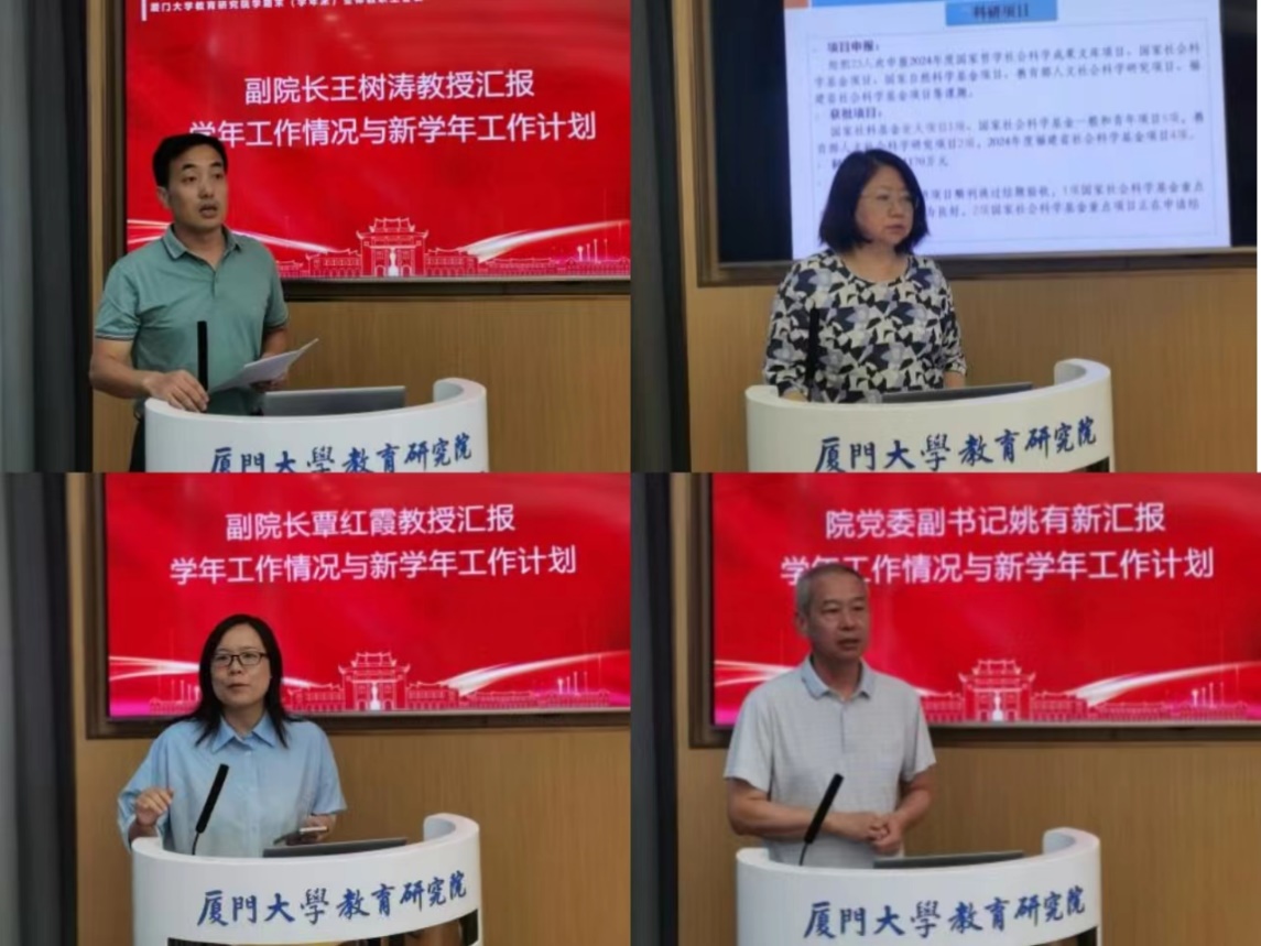 高等教育发展研究中心王树涛教授、赵婷婷教授、覃红霞教授以及教育研究院党委副书记姚有新分别就本学年行政工作人事工作、科研工作、人才培养、党建工作、学生管理、宣传工作等方面进行了工作总结,肯定成绩,指出不足,提出整改措施,并对下学期工作要点进行了说明。