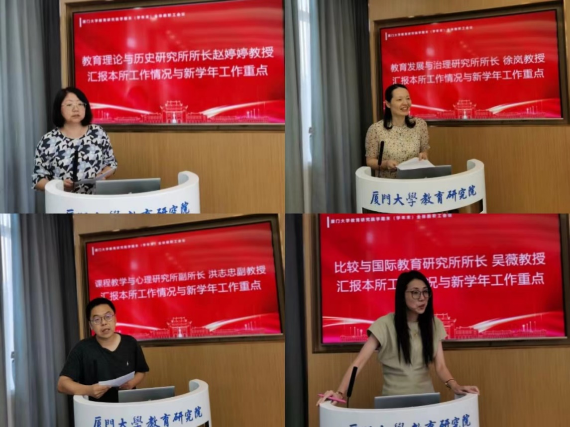 教育理论与历史研究所所长赵婷婷、教育发展与治理研究所所长徐岚、课程教学与心理研究所副所长洪志忠、比较与国际教育研究所所长吴薇分别汇报各研究所本学年以来的工作情况与新学年工作重点。