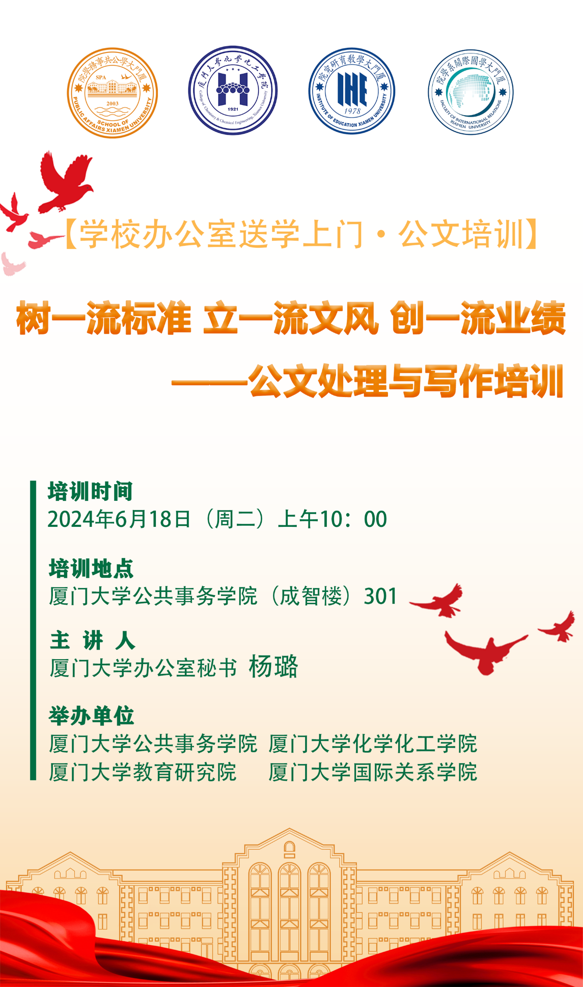 为贯彻习近平总书记关于办公厅工作的重要讲话和指示批示精神,将提高公文质量作为新形势下加强和改进作风建设、锻造高素质专业化干部队伍的重要抓手,规范公文报送程序,提升公文质量,6月18日上午,高等教育发展研究中心联合公共事务学院、化学化工学院、国际关系学院共同邀请厦门大学办公室秘书杨璐在成智楼301会议室开展题为“树一流标准,立一流文风,创一流业绩——公文处理与写作培训”的专题培训。