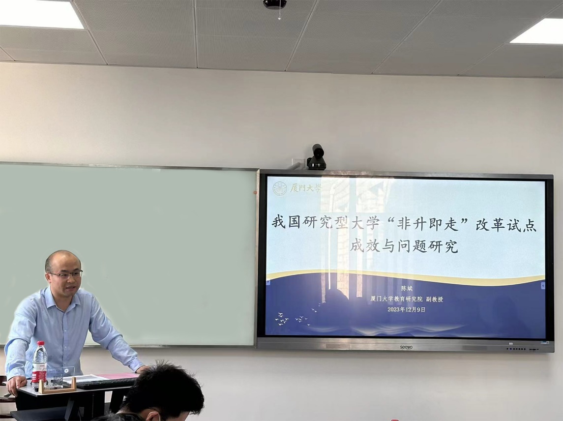 2023年12月9日,陈斌副教授主持的国家社科基金(教育学)青年课题《我国研究型大学‘非升即走’改革试点成效与问题研究》在黄宜弘楼301教室举行。南京师范大学胡建华教授、华东师范大学荀渊教授、中国地质大学(武汉)柯佑祥教授、厦门大学张宝蓉教授、郭建鹏教授受邀担任开题专家。我校社科处王杏飞副处长等莅会指导。