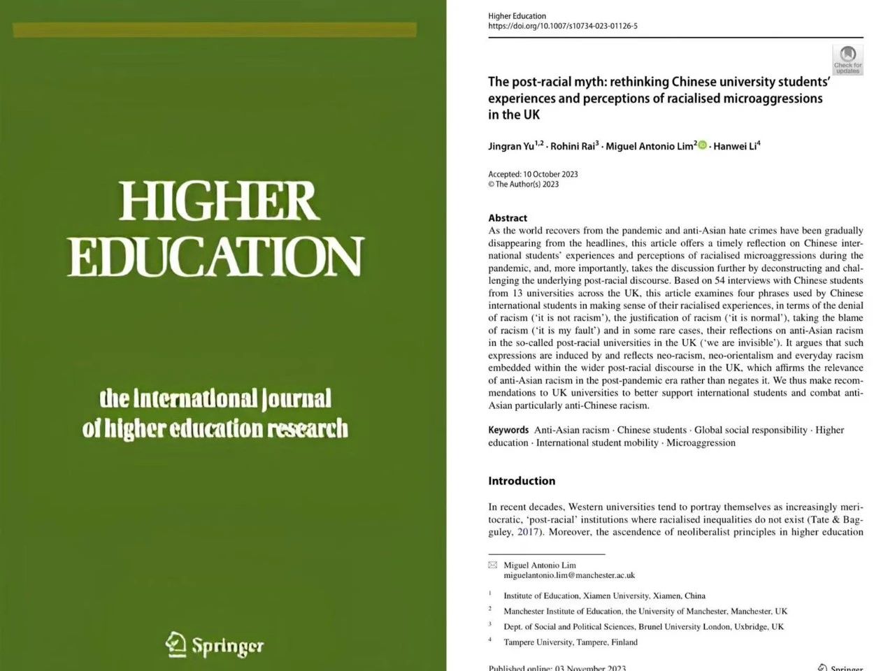 近日,中心助理教授余婧然及国际合作团队在国际高等教育权威刊物《Higher Education》上发表题为“The post-racial myth: rethinking Chinese university students’ experiences and perceptions of racialised microaggressions in the UK”的学术论文。基于对来自13所英国大学的54名中国留学生的深度访谈,该论文剖析了中国留学生在英国高等教育体验中的“后种族迷思”,并揭示其中复杂嵌套的新种族主义、新东方主义和日常种族主义。近几十年来,西方大学倾向于将自己描绘为越来越精英化的、“后种族主义” 的机构,声称种族不平等是不存在的(Tate & Bagguley, 2017)。此外,新自由主义在全球高等教育体系中的盛行使得国际学生往往被物化为“摇钱树”,进一步削弱了公众对这一学生群体的种族化和种族主义方面的人文关切(Waters, 2021)。因此,在英国大学的制度化层面,反亚洲种族主义仍然被边缘化。随着疫情渐渐淡出公众视野,东亚学生遭受的种族歧视也逐渐在西方各大媒体的头条上消失。本文对此做出及时回应,呼吁西方尤其是英国高等教育界关注正再次失去“可见性”的东亚留学生群体,并提出相关政策建议。
