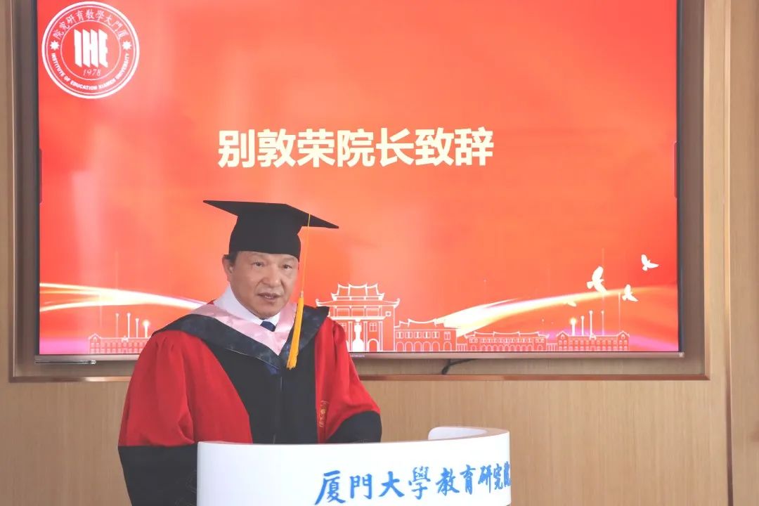 硕士毕业生代表王洪国、Ph.D毕业生代表毛鹏程、Ed.D毕业生代表李政三位毕业生代表依次发言。他们对高等教育发展研究中心的潜心培育和老师们的倾情付出表示衷心的感谢,为所有同窗献上了诚挚的祝福。王洪国表示,将牢记厦大高教学子的身份,秉持“自强不息、止于至善”的校训,在岗位上创造属于自己的荣耀,做出应有的贡献。毛鹏程以学问之道惟“热爱”、“努力”与“坚持”的三词感悟与大家共勉,表达对自己、对同窗、对中心的祝福和期许。李政在发言中谈到,“关于教育有无数的定义,教育的词典里包罗万象,唯独没有‘放弃’”,高等教育发展研究中心就像夜空中最亮的星,无论顺境或逆境,都将照亮厦大中心学子无畏前行。